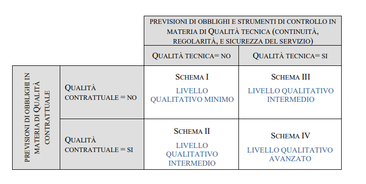 L’Ente territorialmente competente determina gli obblighi di qualità contrattuale e tecnica che devono essere rispettati dal gestore del servizio integrato di gestione dei rifiuti urbani, ovvero dai gestori dei singoli servizi che lo compongono, per tutta la durata del Piano Economico Finanziario, individuando il posizionamento della gestione nella matrice degli schemi regolatori di cui alla seguente tabella, sulla base del livello qualitativo previsto nel Contratto di servizio e/o nella Carta della qualità vigente/i che deve essere in ogni caso garantito. Lo schema adottato dal Comune di Pettorano è il numero 1 LIVELLO QUALITATIVO MINIMO. La scelta è stata operata sia per evitare ulteriori costi a carico degli utenti (la scelta dello schema 3 avrebbe comportato un aumento di circa il 7% della tariffa) sia per avviare un percorso graduale di miglioramento della qualità del servizio. A partire dal 2022, infatti, il Testo unico per la regolazione della qualità del servizio di gestione dei rifiuti urbani (TQRIF) prevede l'adozione e il rispetto di alcuni obblighi di servizio anche per gli enti che hanno scelto lo schema regolatorio 1.